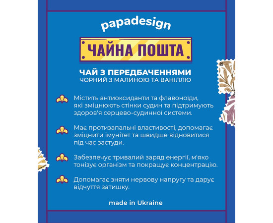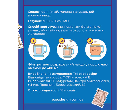 Склад: Чорний чай, малина, натуральний ароматизатор