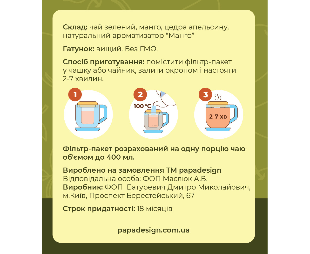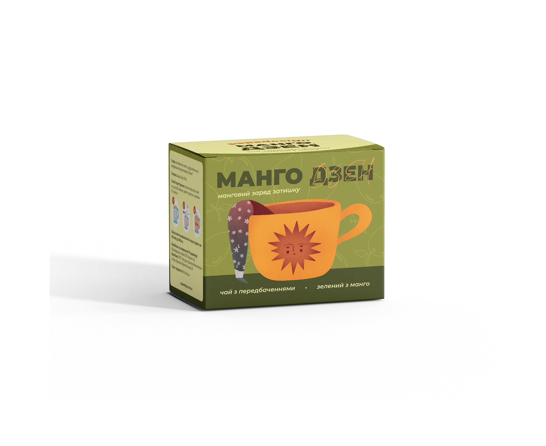 Склад: Чай зелений, манго, цедра апельсину, натуральний ароматизатор "Манго"