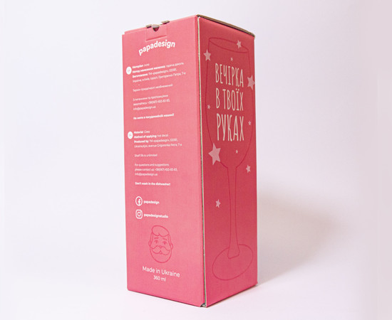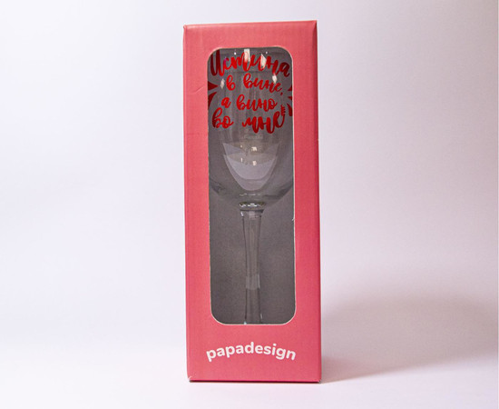 Ми тільки хочемо сказати, що в нашому незвичайному келиху зібрана вся винна мудрість століть, доповнена модною прикольною сучасною сентенцією «а вино в мені». Нехай в тобі буде більше вина, істини, щастя, вишуканої винної філософії і тонкого гумору! Усе це і буде – варто тільки замовити крутий і стильний келих у улюбленого PAPAdesign. А доставка всіх цих приємностей буде найшвидшою, яка тільки можлива.