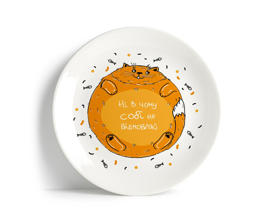 Але, якщо за якимось дивним збігом обставин, вам віра не дозволяє відповідати відв'язному способу життя цієї наймилішого істоти – то таку тарілку завжди можна купити в подарунок вашій подрузі, або не дуже подрузі. У першому випадку ви отримаєте очікувану веселу реакцію близької вам людини. А в другому – реалізуєте хитромудрий план із зломлення сили волі вашої суперниці. Цілком імовірно, що тепер з кожною новою зустріччю ви будете помічати, як вона неухильно починає набирати вагу і перетворюватися на філософа, який віщає з тарілки (не переживайте, тарілка з принтом "Сміх злого генія" у нас уже в розробці).